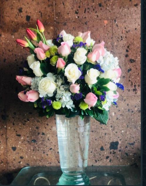 Hermoso Arreglo de tulipanes rosa en base de vidrio. ♥ Cristales Rosas. Las flores son el cómplice perfecto le alegraran su día y te recordara por siempre.