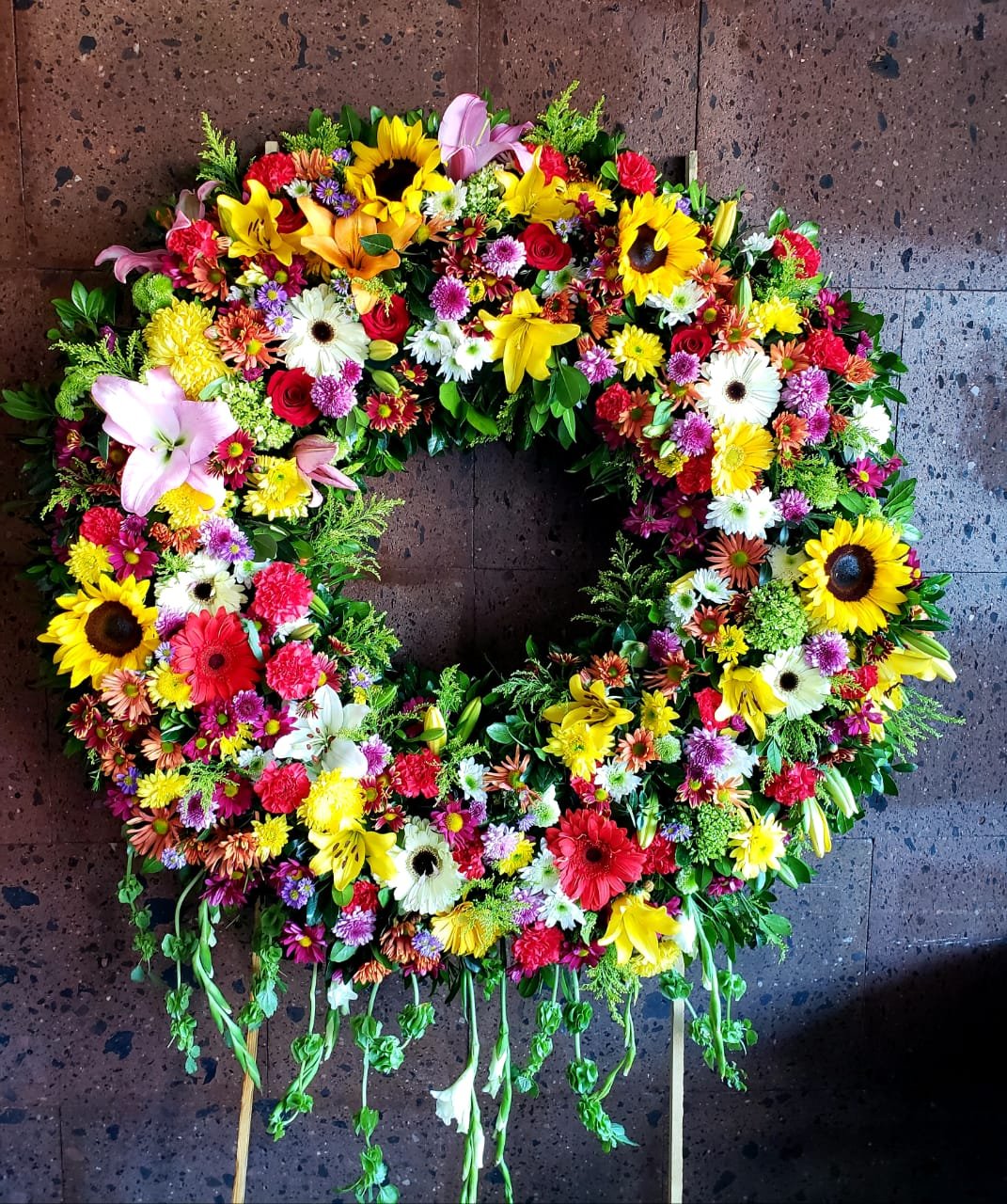 Corona Redonda Primaveral. El Adios mas hermoso lleno de colores !!! Sin duda la Corona Redonda Primaveral es un detalle de amor para despedir a nuestra persona amada.Corona Redonda Primaveral De venta en Floreria Paola 2 ,  ubicados en Cd Juarez Chihuahua.